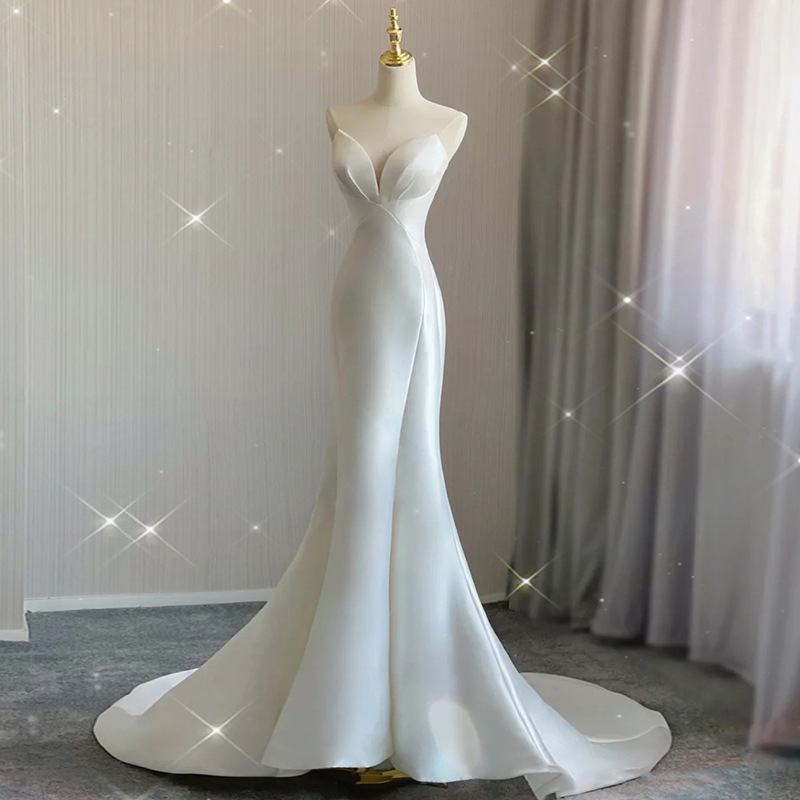 Gaun pengantin ringan Satin 2024 baru Asia Tenggara shopee pengantin pernikahan elegan pinggang fishtail gaun bahu terbuka