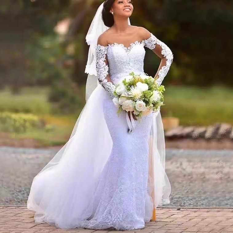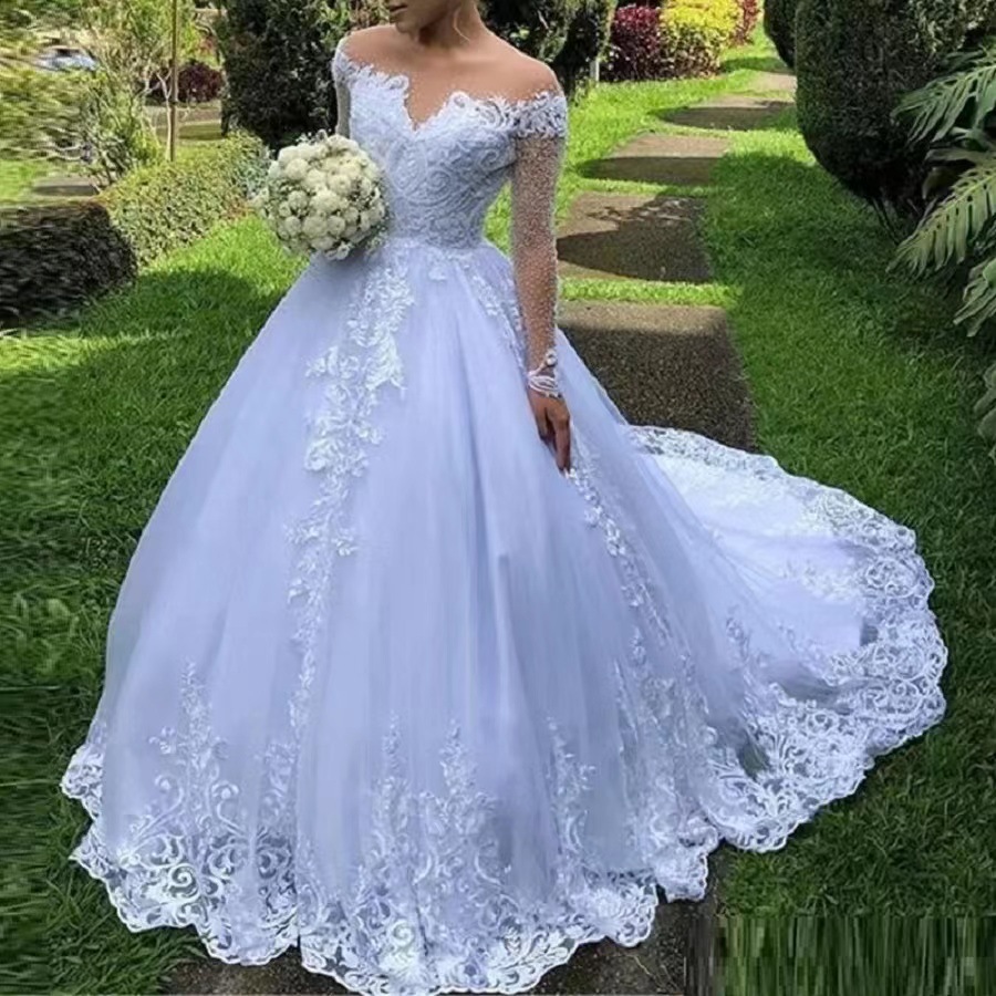 Gaun pengantin renda lengan panjang model baru musim panas 2025 untuk perdagangan luar negeri Amazon, gaun pengantin renda panjang dengan ekor.