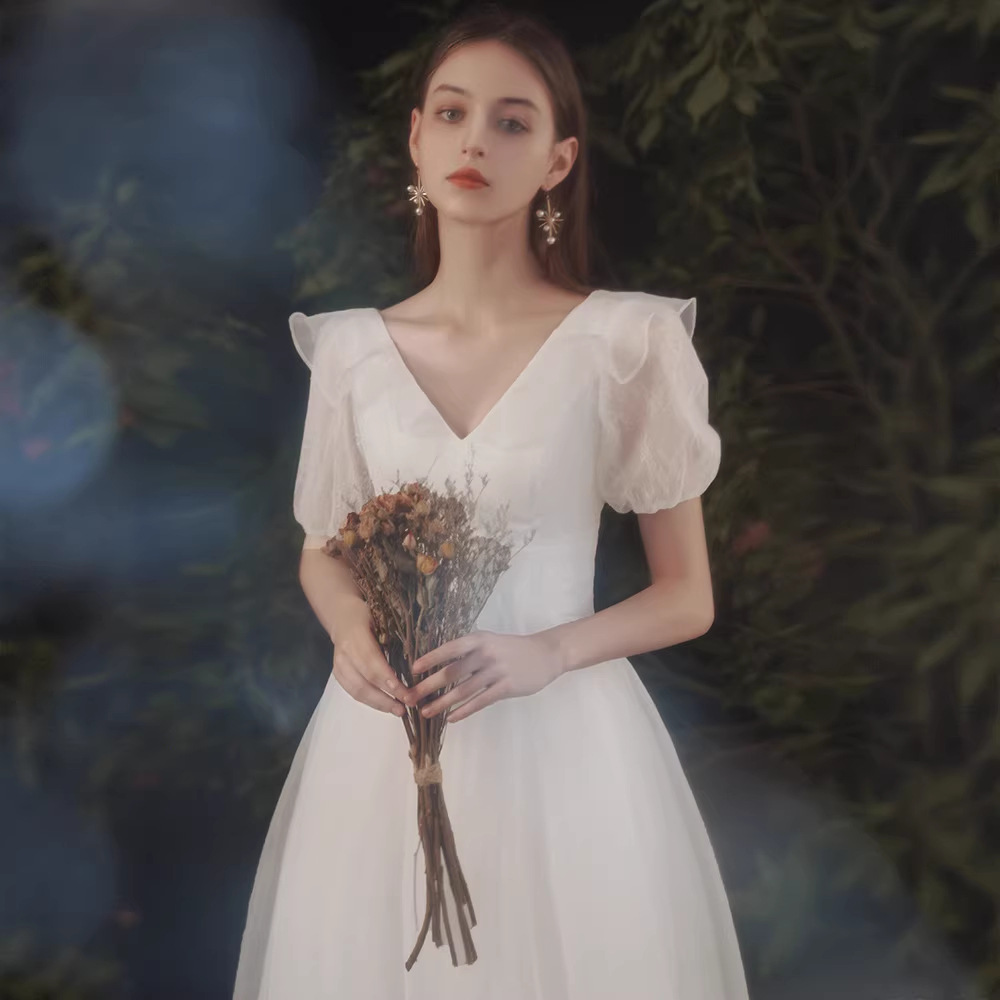 Gaun pernikahan cahaya fotografi perjalanan Perancis gaun putih kecil pendaftaran temperamen Super peri gaun pertunangan sederhana Mori luar ruangan