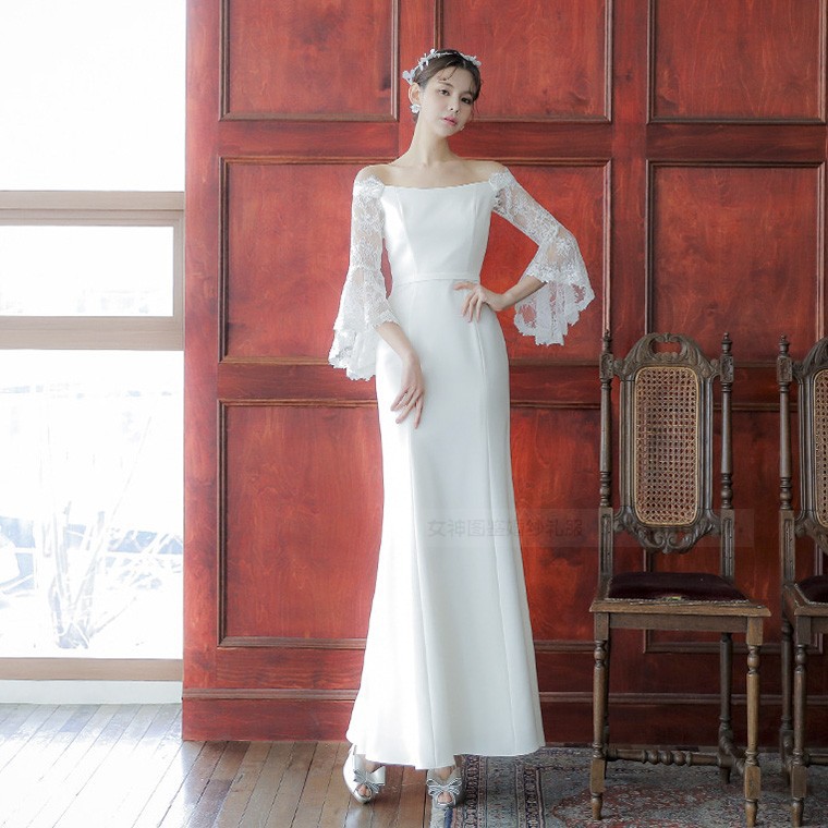 Gaun pengantin ringan, baru elegan renda bahu terbuka Mori gaun perjalanan pernikahan pengantin Korea elegan sederhana