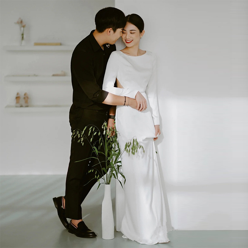 Gaun pernikahan Cahaya punggung terbuka seksi sederhana satin lengan panjang benang luar ruangan pengantin perjalanan menembak putih gaun berlisensi Prancis
