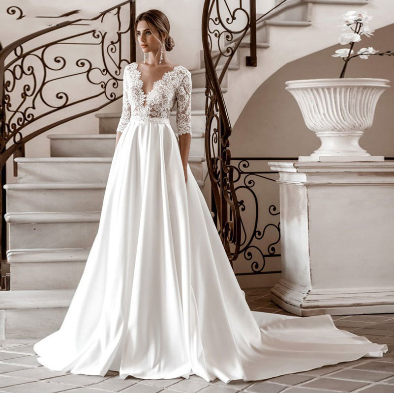 Gaun pernikahan satin panjang, gaya Eropa dan Amerika Perdagangan Luar Negeri Amazon AliExpress berharap stasiun independen renda baru leher V lengan setengah