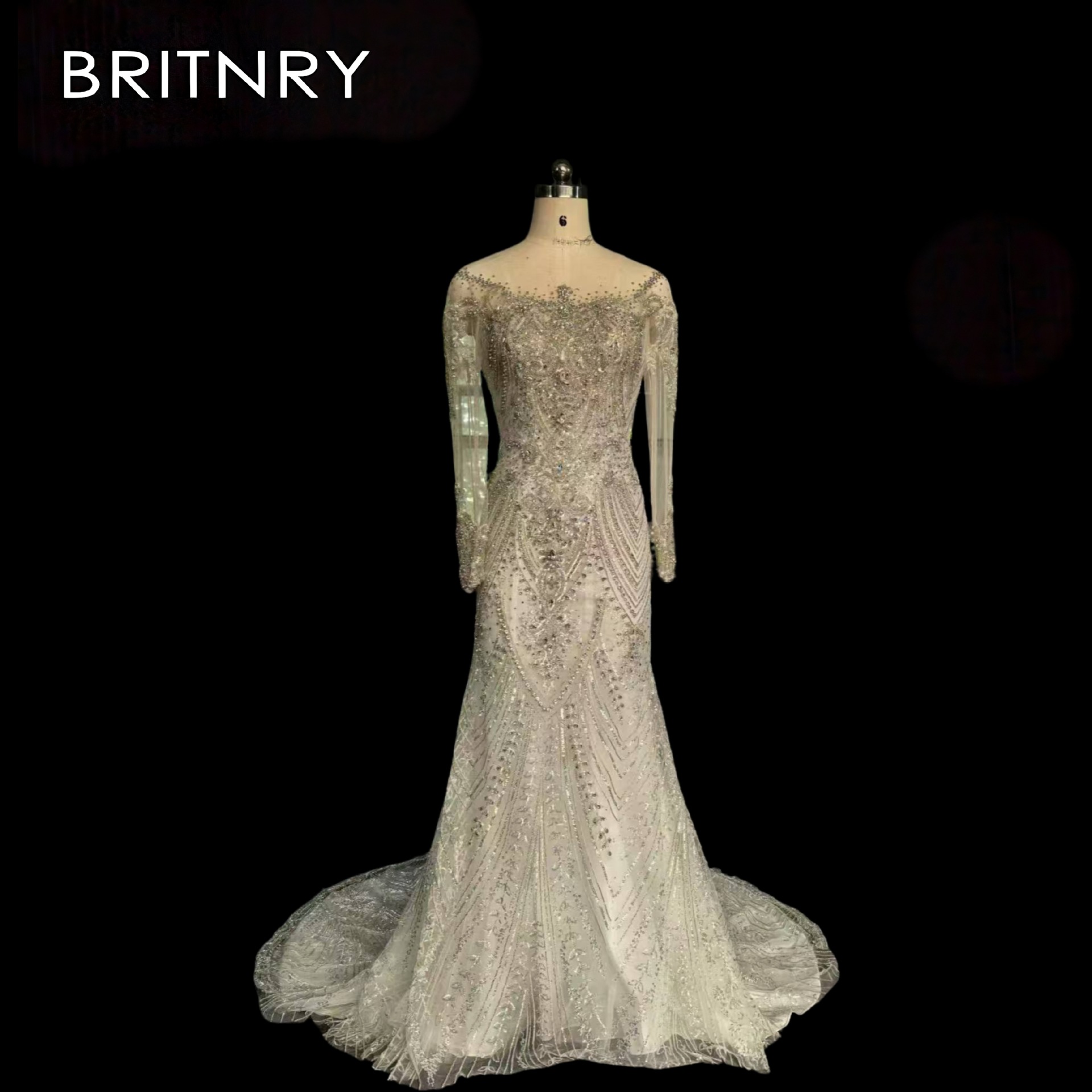 Gaun pengantin model Prancis untuk perdagangan lintas batas tahun 2025, model baru dengan bordir manik-manik berat, lengan panjang off-the-shoulder, gaun utama vintage dengan ekor panjang.
