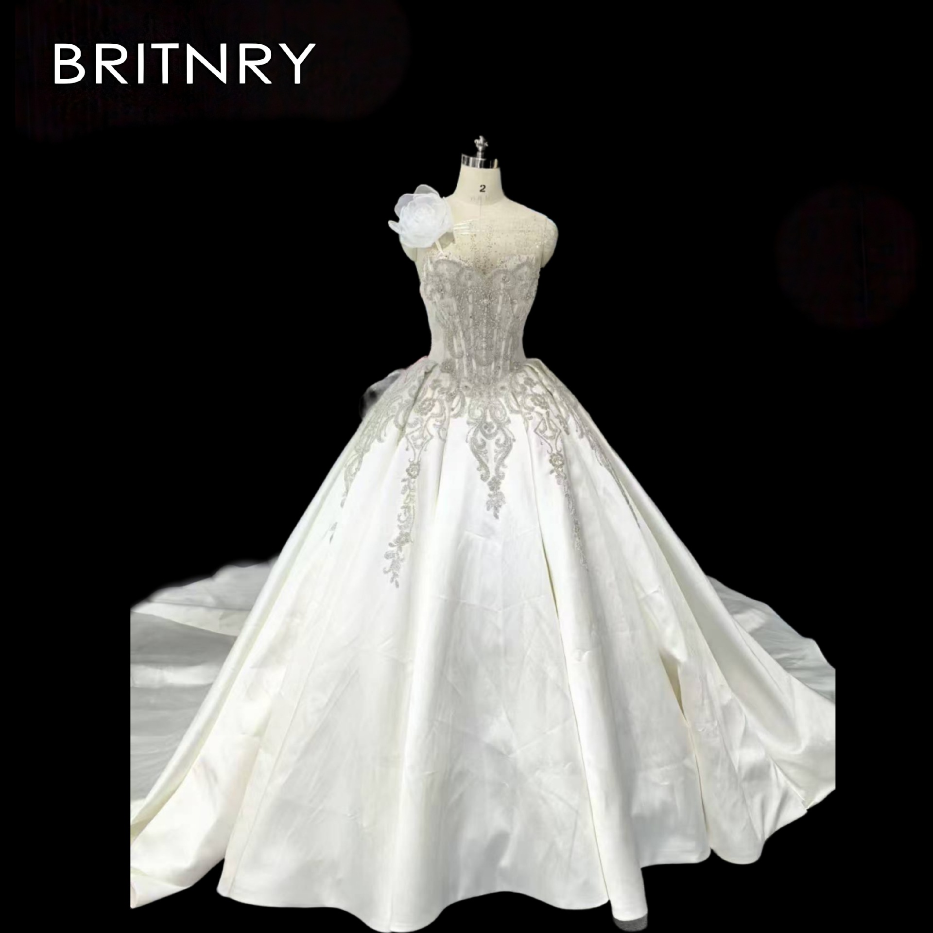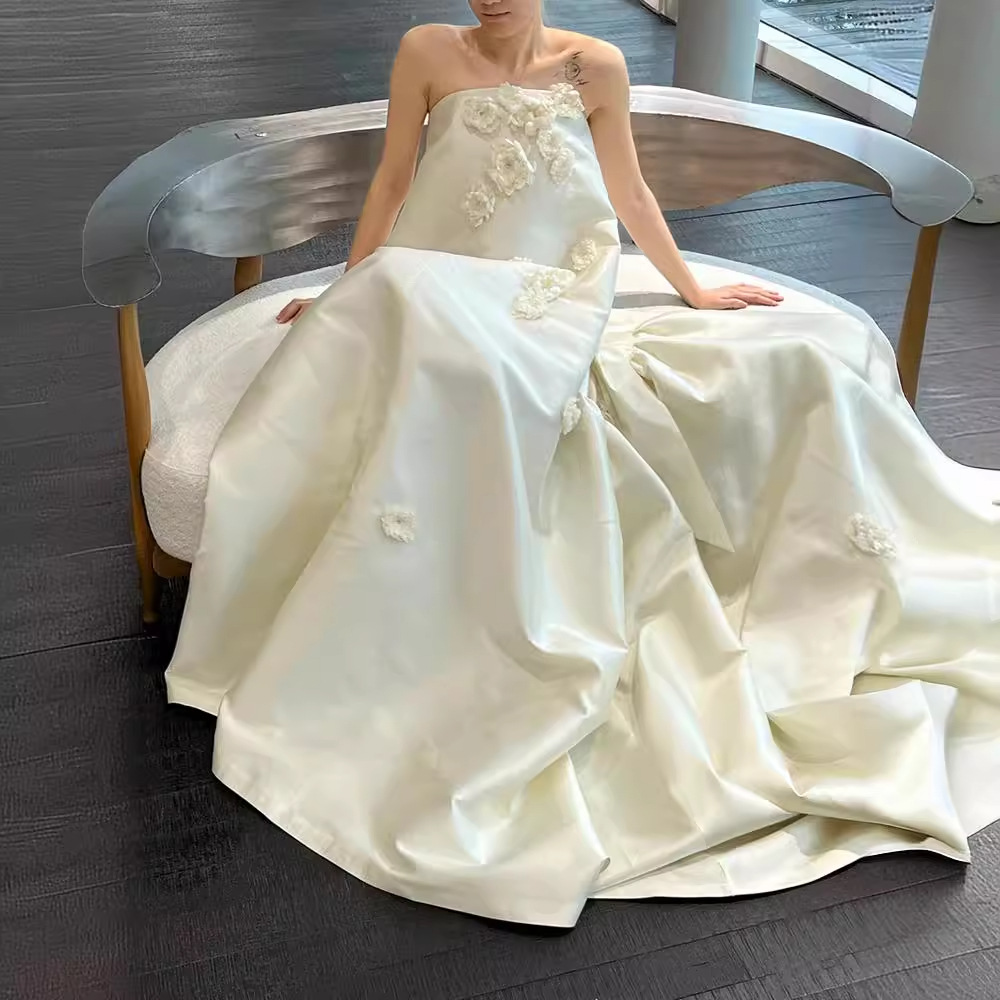 Gaun pengantin satin panjang menjuntai bergaya Eropa dan Amerika, tanpa tali, ramping, sederhana, untuk pesta pernikahan musim semi 2025.