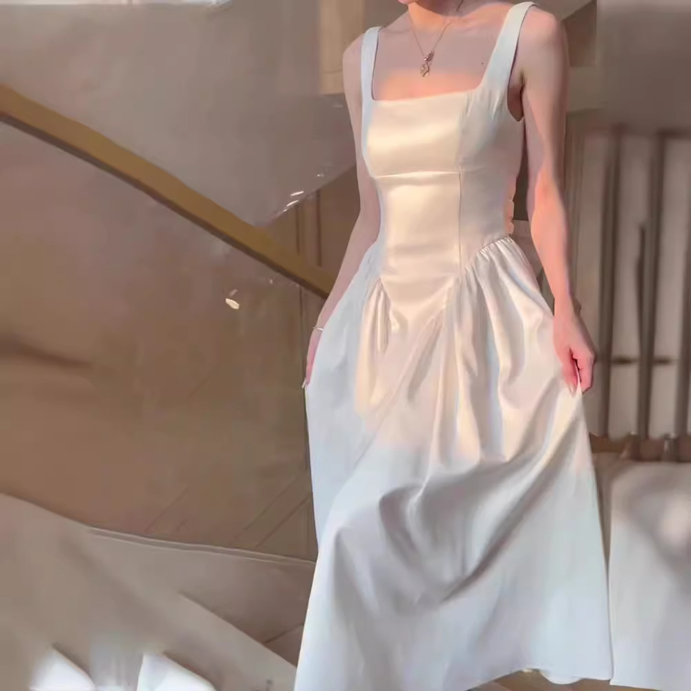 Gaun pernikahan cahaya gaya Perancis Satin, gaun satin baru putih susu sederhana segar perjalanan pernikahan tali Satin