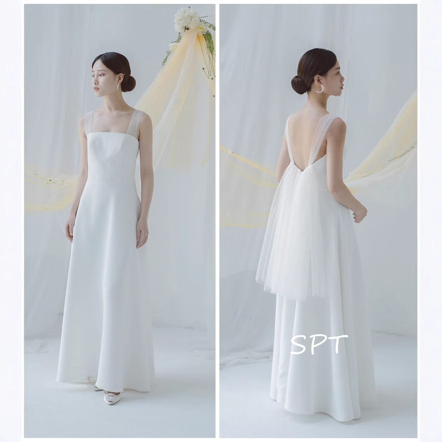 Gaun pengantin tali Perancis, gaun putih kelas atas dengan sertifikat satin sederhana perjalanan luar ruangan fotografi Mori gaun wisuda