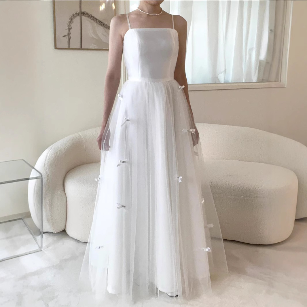 Gaun pernikahan cahaya putih, gaun upacara pertunangan dewasa sederhana dengan tali baru 2024, gaun harian pita tanpa punggung