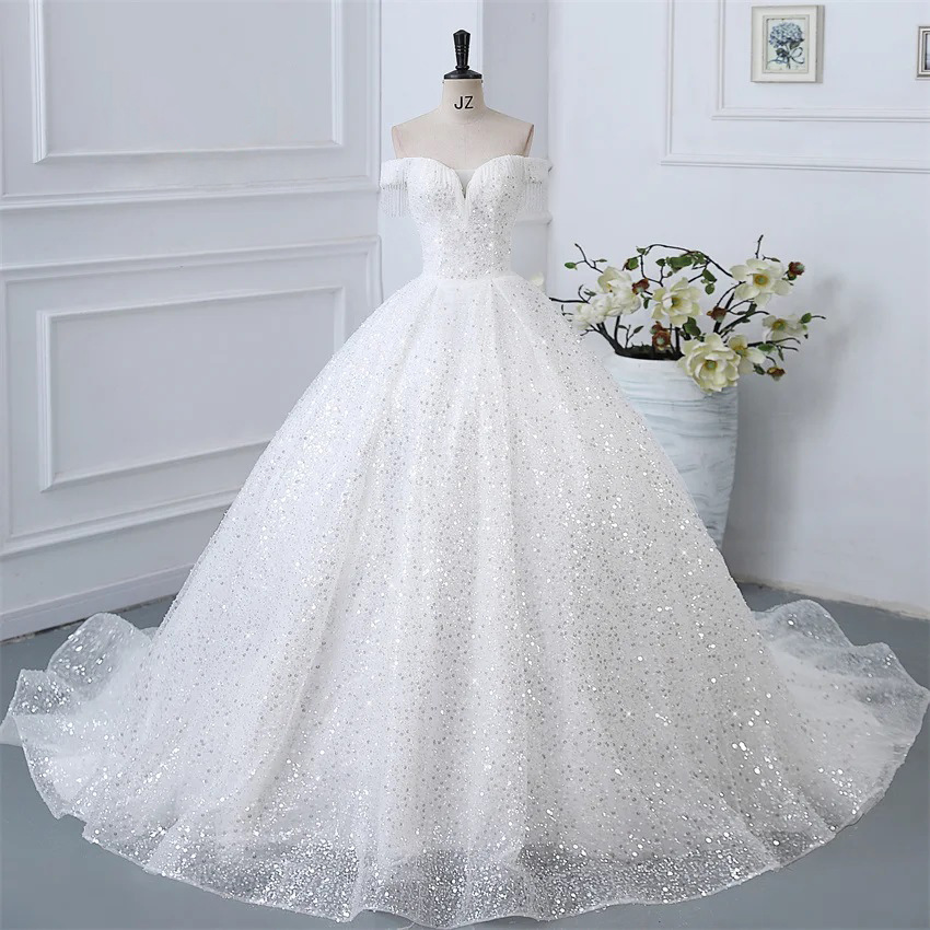 Gaun pengantin impor model terbaru 2025, model off-shoulder dengan bordir berat, gaya vintage Prancis, dengan ekor panjang untuk musim semi dan panas.