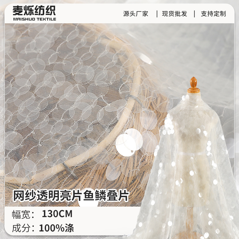 源头工厂网纱15mm透明鱼鳞亮片绣 婚纱礼服舞蹈服鱼尾裙童装布料