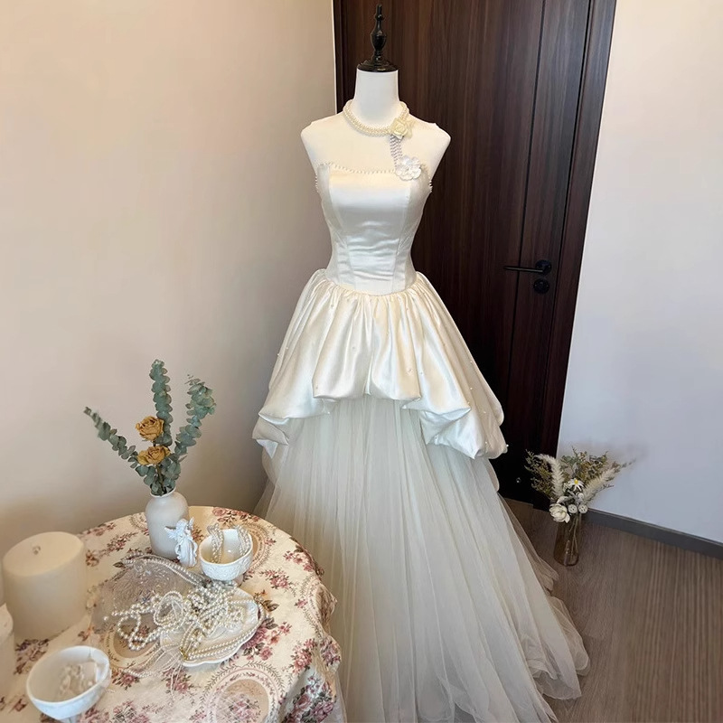 Gaun pernikahan gaya Perancis tube top light elegan sederhana pengantin putih niche cahaya mewah satin luar ruangan benang pertunangan gaun selamat datang