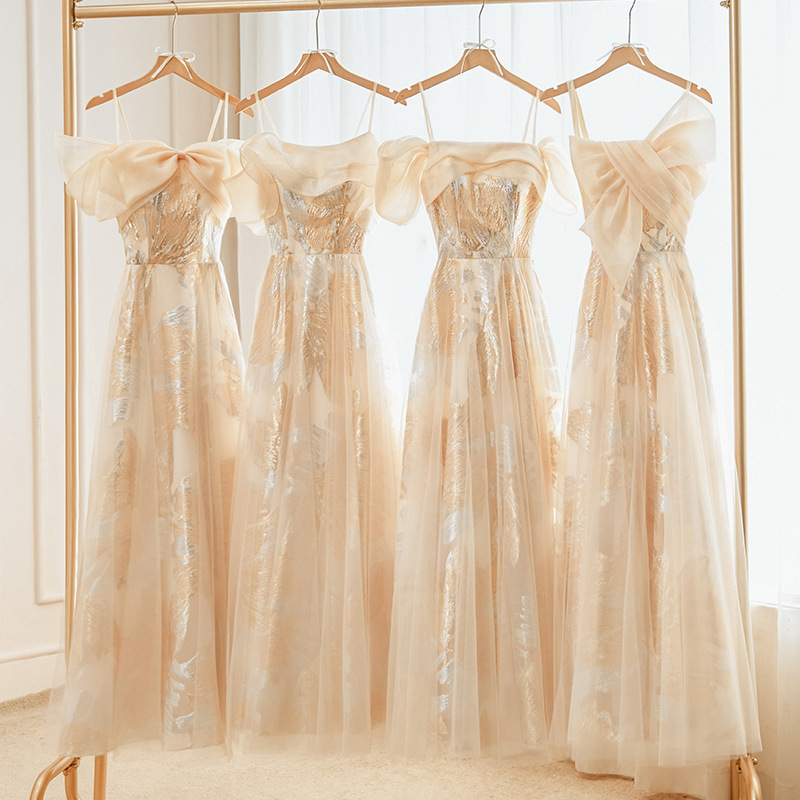 Gaun pengiring pengantin warna sampanye untuk wanita, gaun kelompok saudari pengantin musim semi dan gugur 2025 terbaru, gaya niche mewah, dapat dipakai santai.