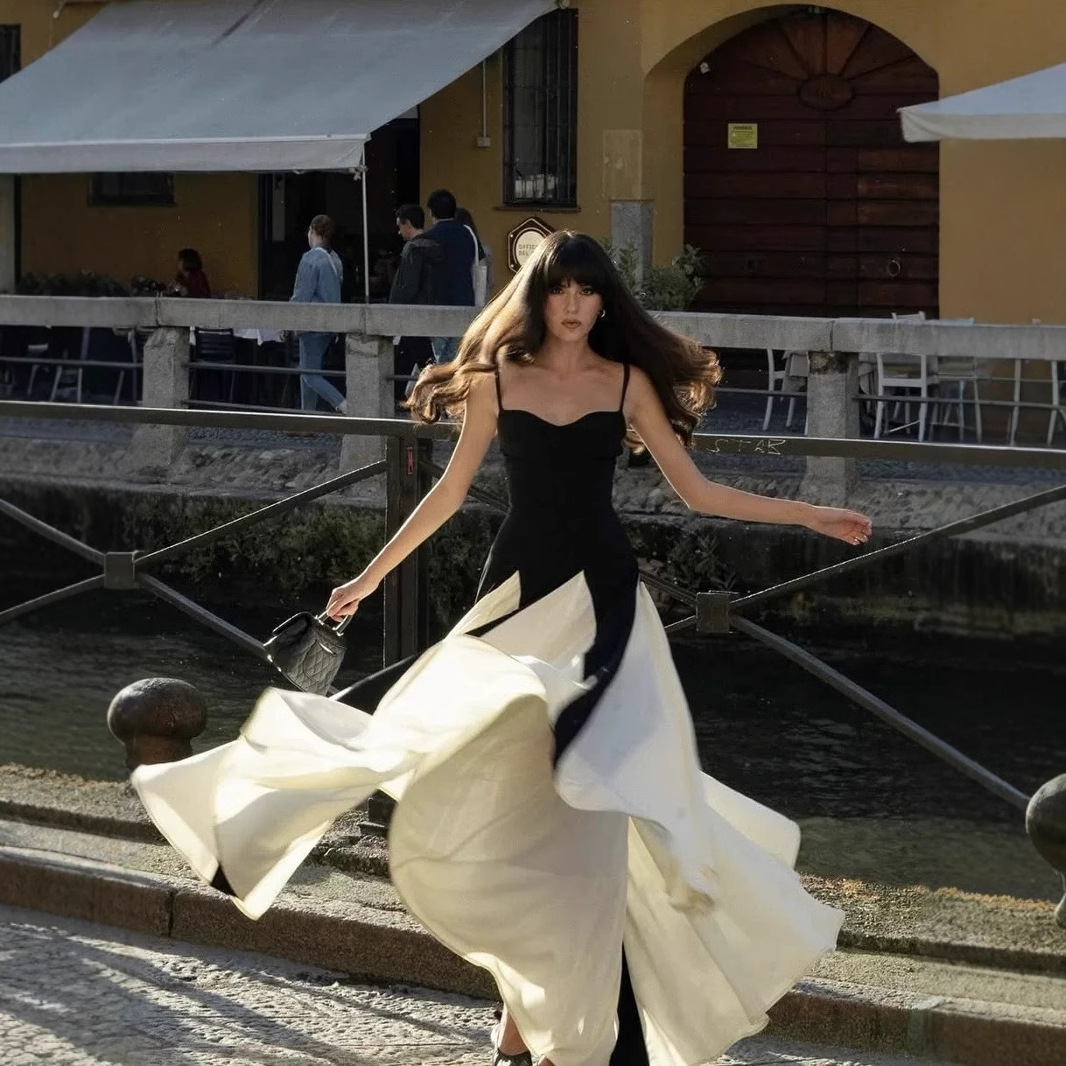 Gaun Wanita Model Prancis Retro Warna Kontras Sambungan 2025ss Gaun Rok Panjang Suspender Pinggang Elegan