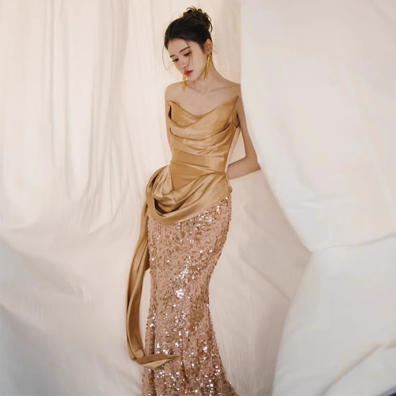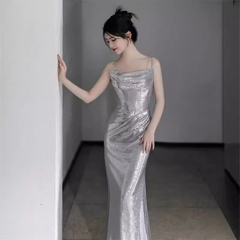 Gaun Malam Payet Perak Gaun Gaun Suspender Ekor Ikan Mengikat Pinggang Perjamuan Tuan Rumah Elegan Model Baru 2025