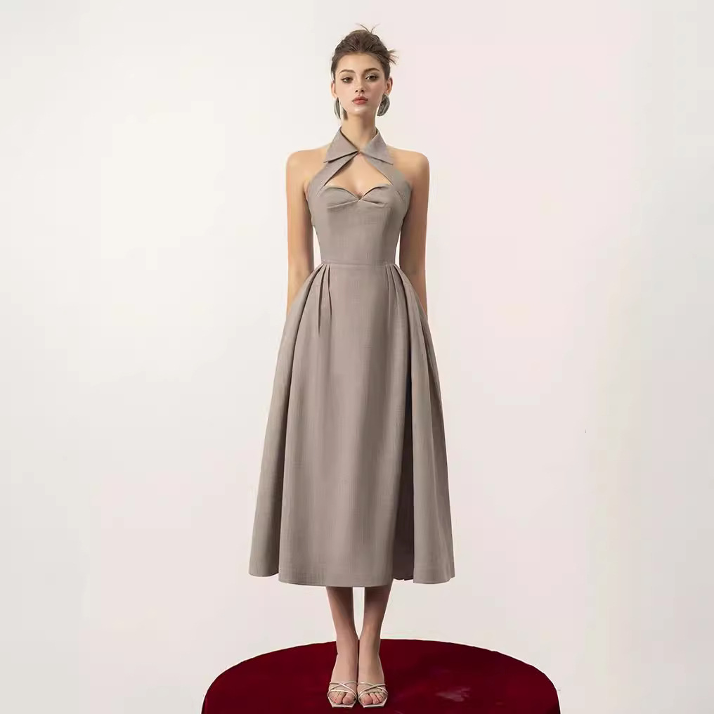 Gaun abu-abu halter kerah kelas tinggi, rok panjang 2024 elegan pinggang retro 40112