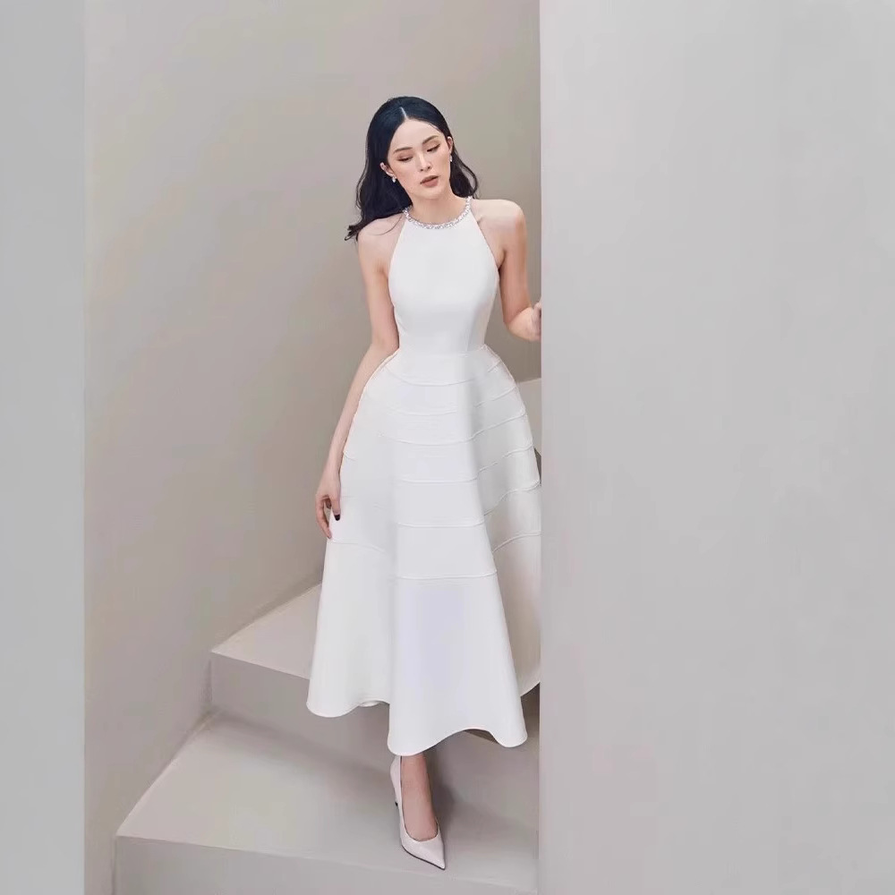 Musim Semi dan Musim Panas 2025 Gaun Pesta Malam Tanpa Lengan Warna Putih dengan Leher Berlian