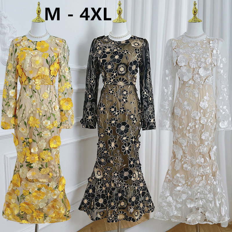 Gaun Wanita Lintas Batas Musim Semi 2025 Rok Gaun Ekor Ikan Membentuk Badan Bordir Pinggang Bunga Tiga Dimensi Gaya Perancis