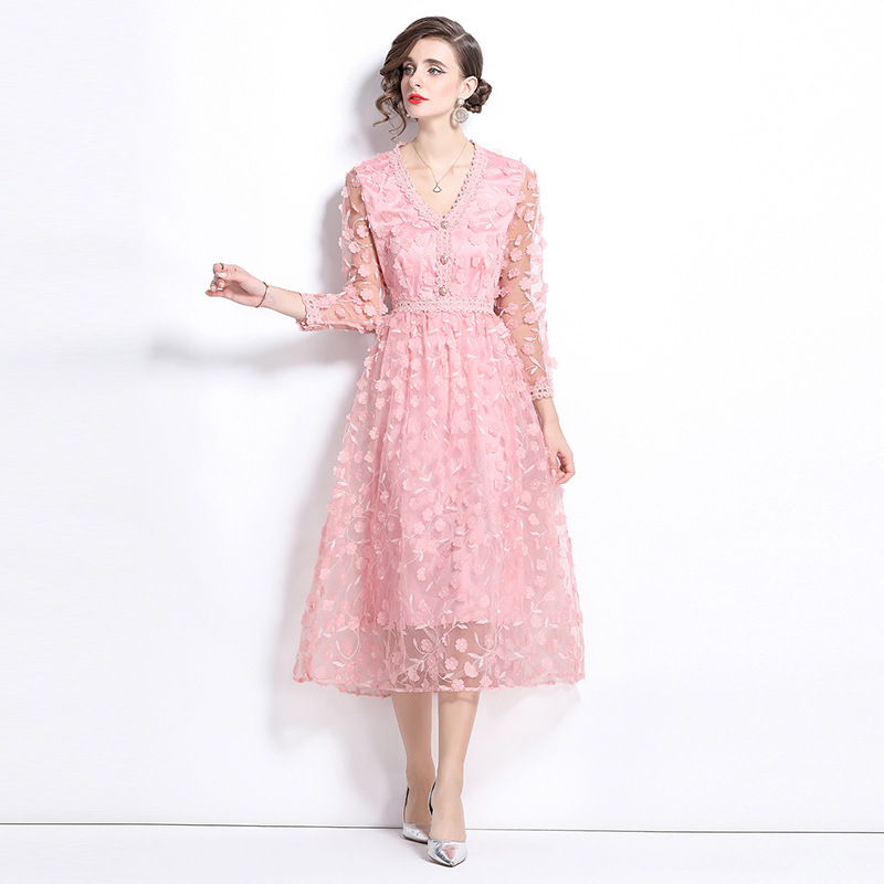 8562 Rok Panjang Gaun Bordir Jala Wanita Model Baru Musim Semi dan Musim Gugur Foto Padat Gaun Ketat Pinggang Kerah V Modis Elegan