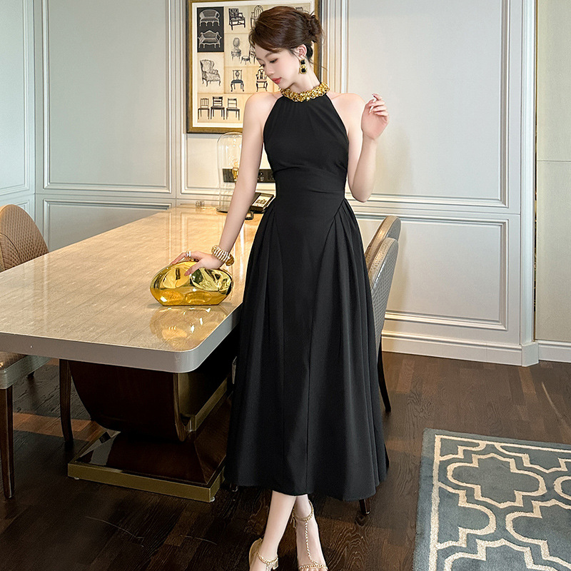 Gaun hitam musim panas 2025 baru wanita model halter neck Prancis, ramping, tanpa lengan, panjang, dan mengecilkan pinggang 9835