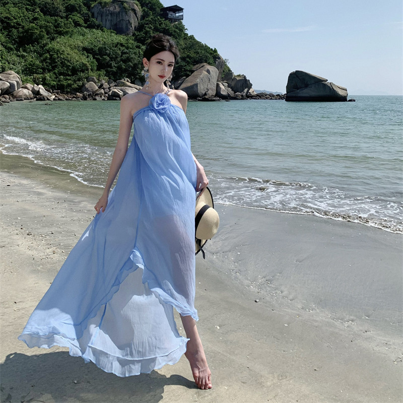 新娘晨袍礼服轻奢小众宽松蓝色挂脖花朵沙滩度假裙连衣裙