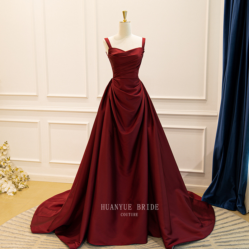 Pakaian Bersulang Merah Anggur Gaun Malam Elegan Permukaan Satin Terlihat Langsing Rok A Model Panjang Kerah Persegi Gaya Prancis dengan Tali Gantung