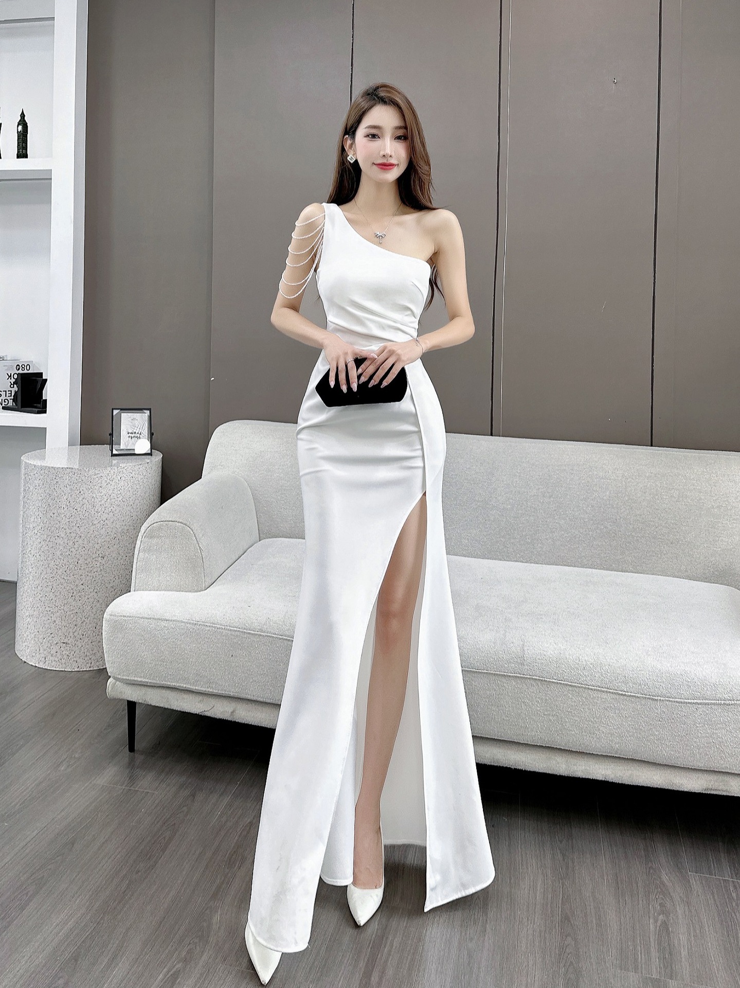Gaun malam putih lengan panjang untuk wanita, gaun tuan rumah tahunan untuk wanita, Gaun malam elastis baru 2023