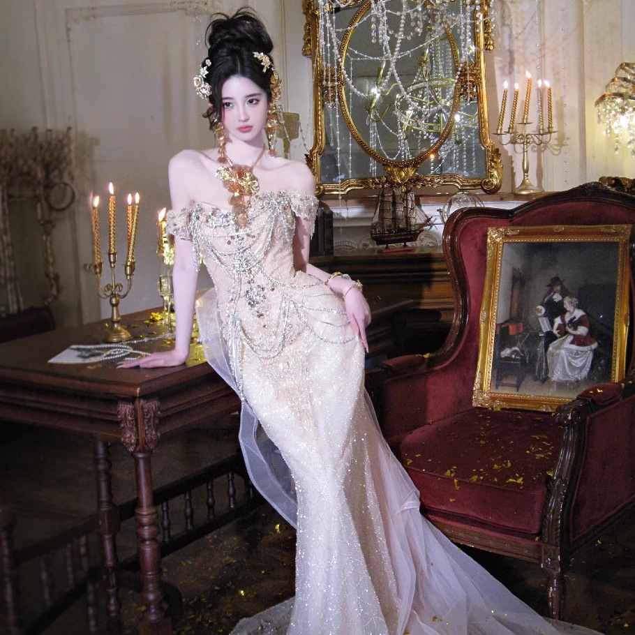 Gaun Malam Ekor Ikan Bahu Miring Seksi Slim Fit Kelas Atas Kemewahan Kelas Atas Gaya Elegan Model Baru Gaun Wanita