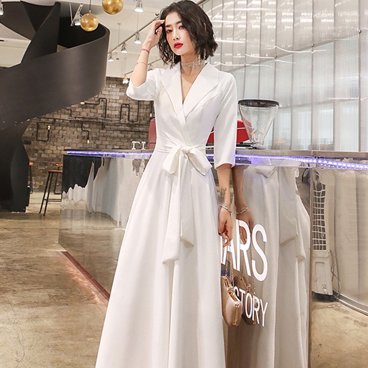 Gaun malam putih untuk wanita, gaun jamuan makan malam elegan tampan musim gugur dan musim dingin, gaun pertunangan panjang bisa dipakai di waktu biasa