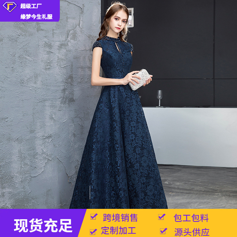 Gaun malam untuk wanita baru 2024 baru dewasa elegan kerah tegak biru dongker gaun tuan rumah paduan suara kinerja gaun panjang