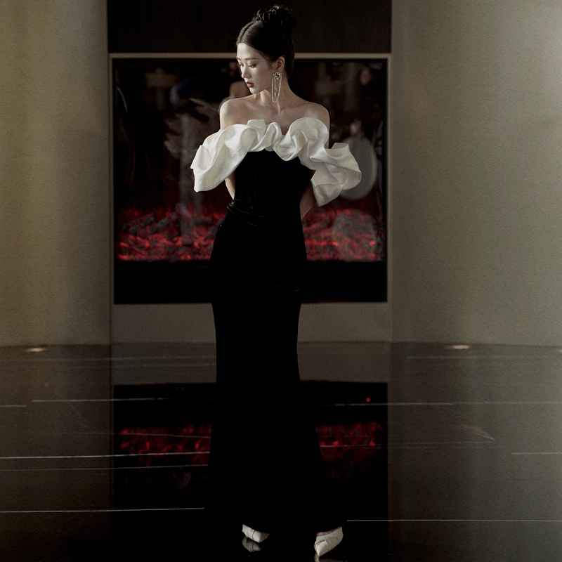 Gaun malam gaya Perancis, baju ekor ikan, temperamen niche, mewah, bahu terbuka, hitam, gaya Perancis