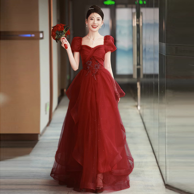Gaun merah anggur bersulang 2023 pengantin baru temperamen pernikahan gaun tuan rumah kostum paduan suara wanita