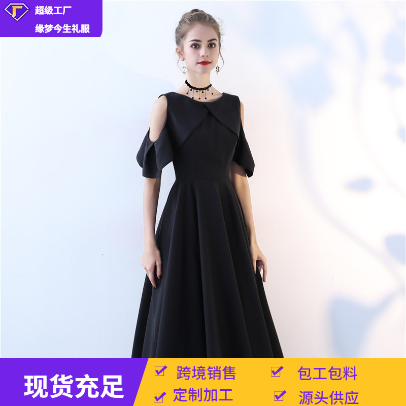 Gaun malam wanita, gaun pesta model baru, gaun jamuan makan, gaun tuan rumah, gaun pesta pelangsing hitam panjang setengah Musim Panas 2020