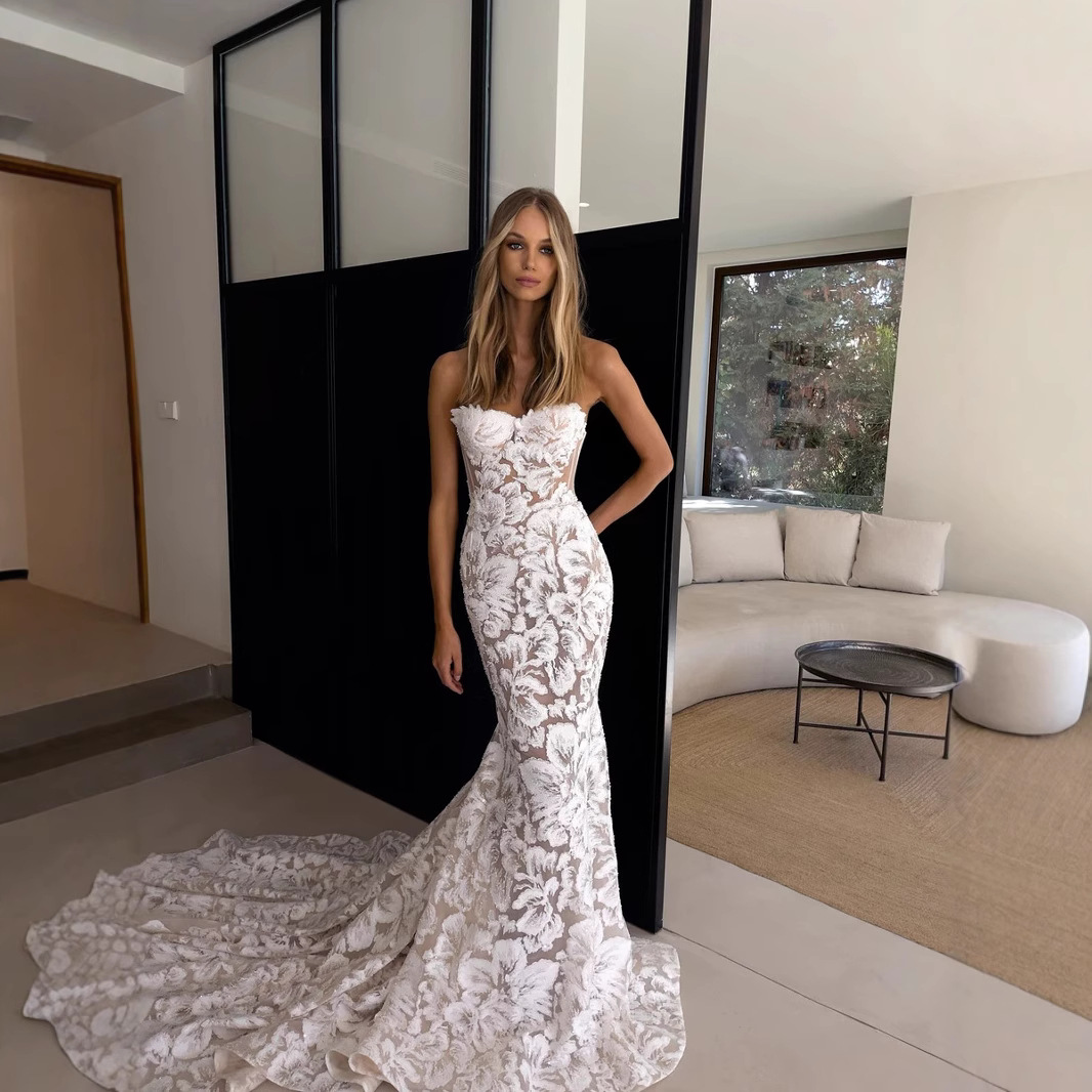 WeddingDress Slim Fit Langsing Langsing Langsing Bahu Seksi V-neck Renda Ekor Kecil Ekor Bersulam Ekor Ikan