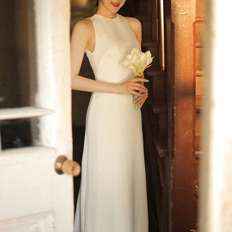 Gaun pernikahan satin Prancis, Gaun kecil foto retro, gaun putih kecil lisensi tali benang pintu tembakan perjalanan