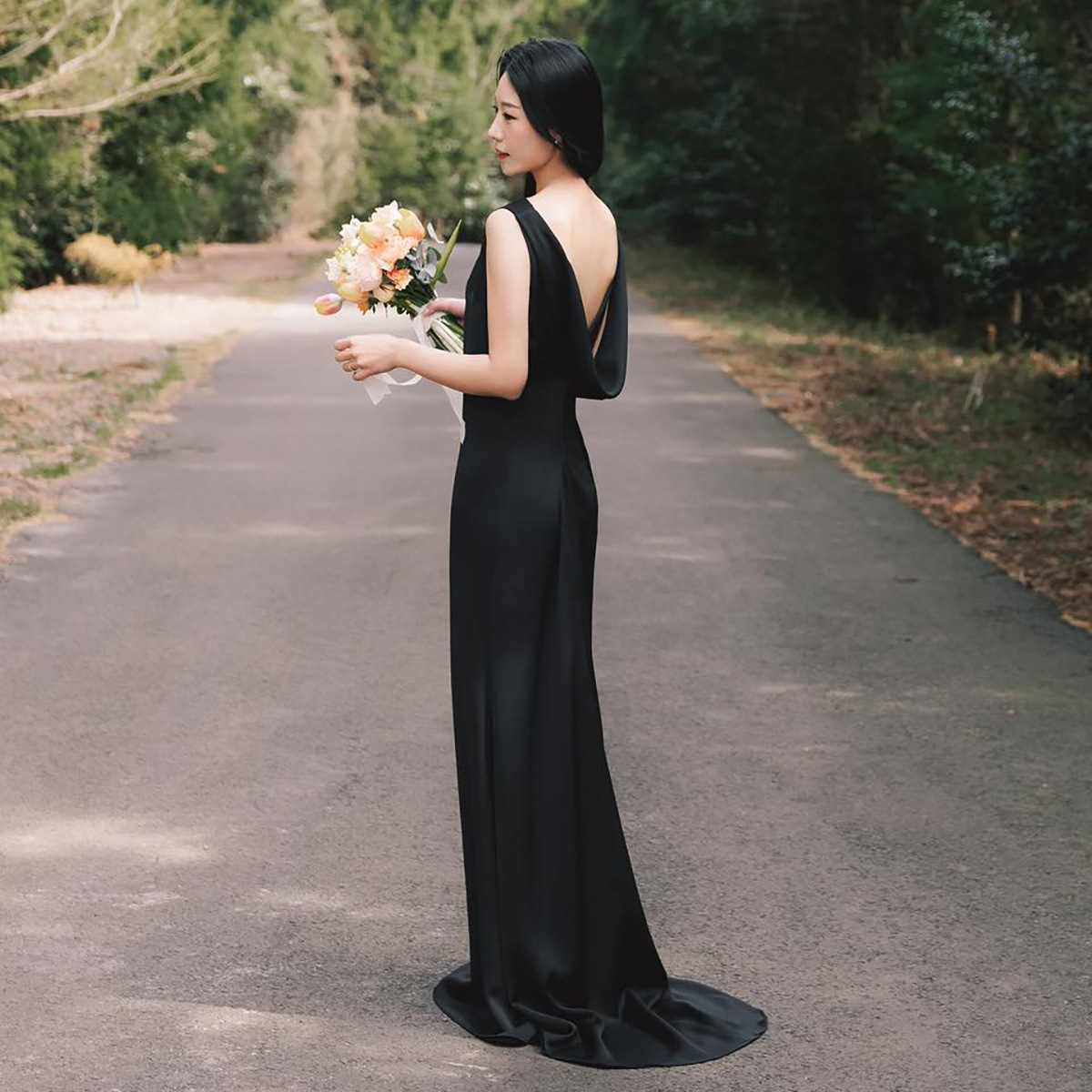 Gaun pernikahan ringan gaya Perancis gaun raket travel luar ruangan selubung ekor ikan kualitas tinggi niche punggung terbuka hitam ekor sederhana satin