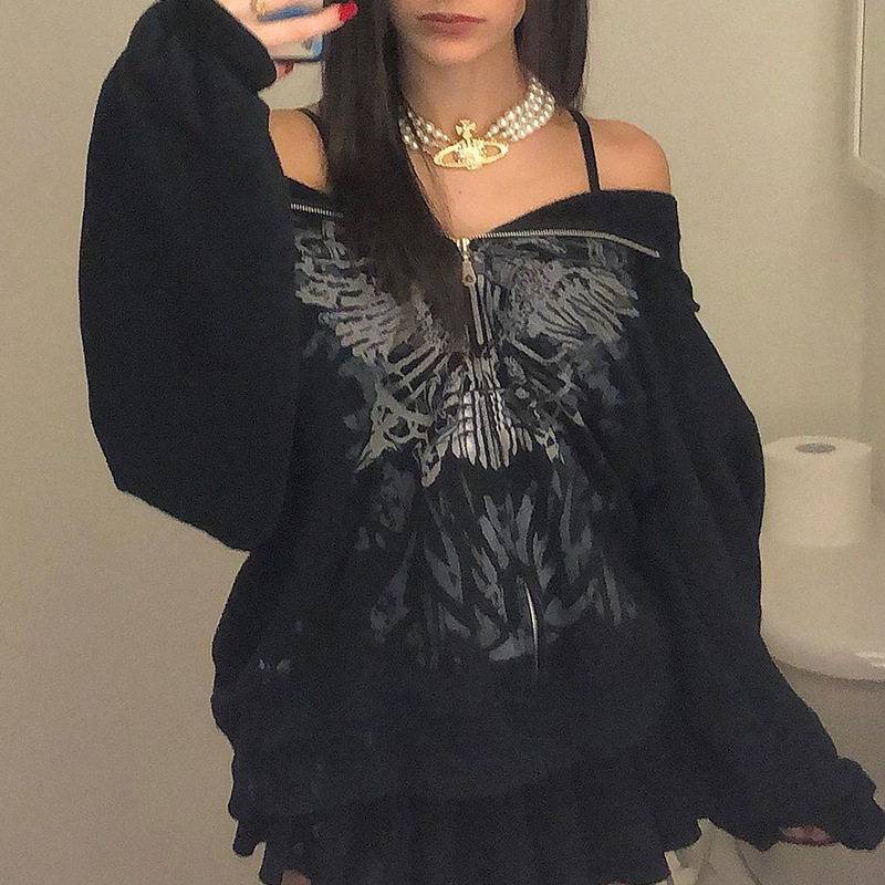 Sweter bertudung lengan panjang ritsleting cetak vintage kupu-kupu kasual longgar mantel kardigan UNTUK WANITA-0532