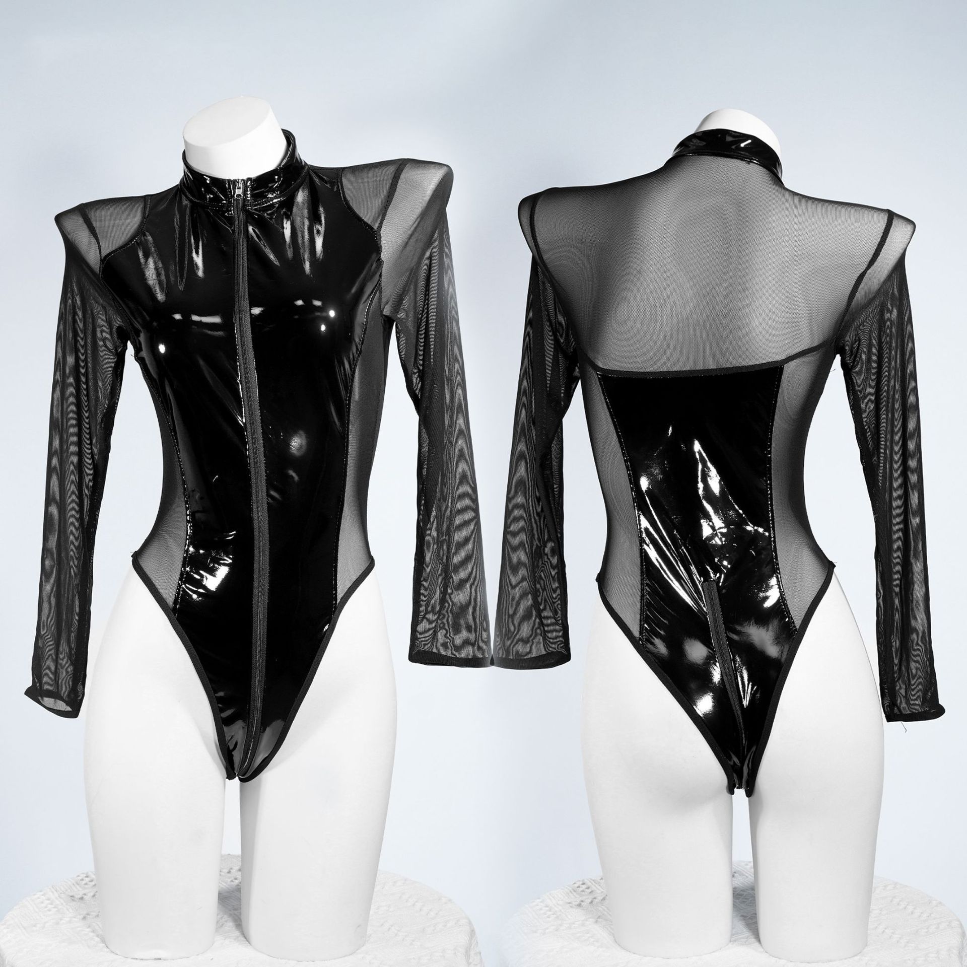 Jumpsuit kulit paten garpu tinggi seksi jumpsuit mengilap pakaian dalam lengan panjang ritsleting punggung terbuka seksi pakaian performa sekunder Y0280