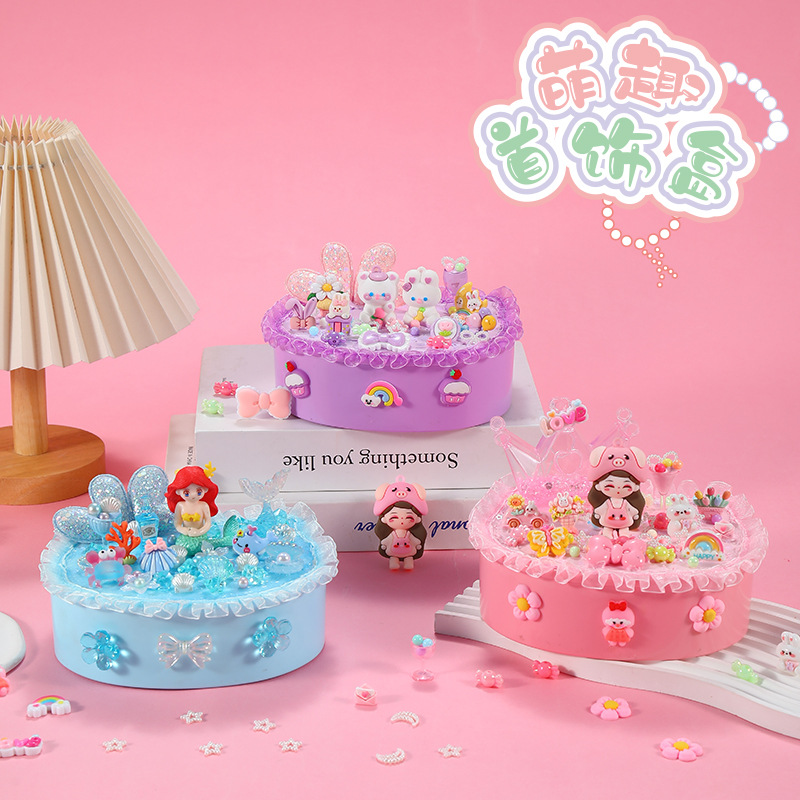 Kotak Harta Karun Buatan Tangan Anak-Anak Kotak Penyimpanan Aksesoris Perhiasan Gadis Lem Krim Tempel Set Kotak Perhiasan Lucu