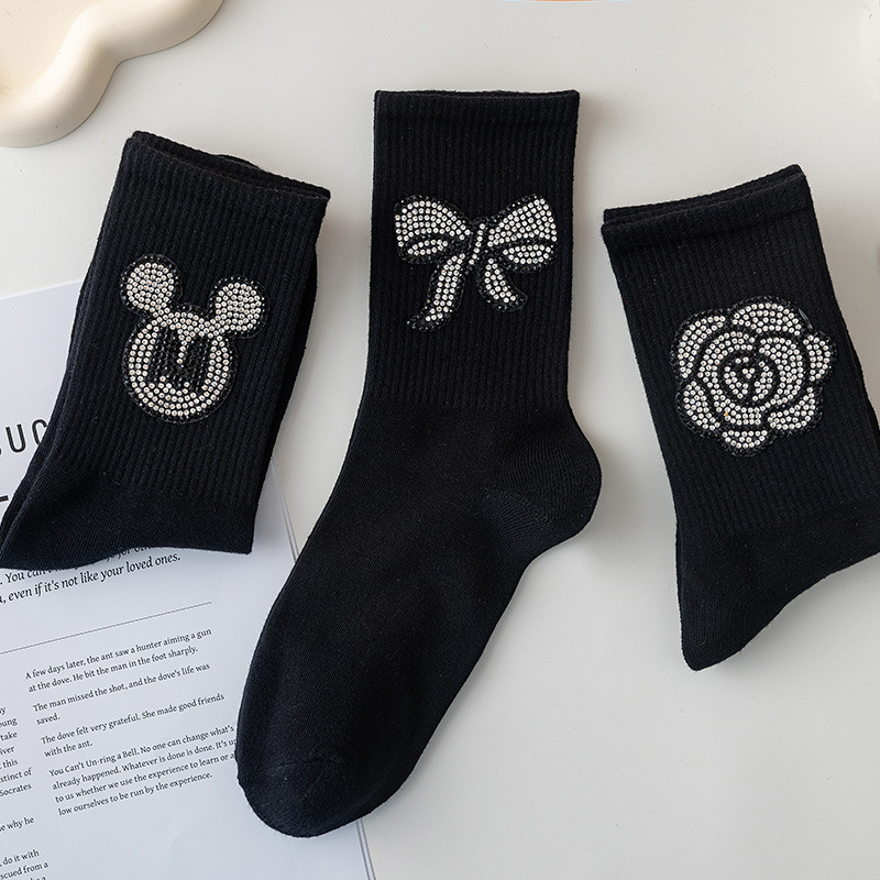 Kaus kaki setengah betis berlian imitasi hitam modis untuk wanita kaus kaki wanita baru musim gugur dan musim dingin kaus kaki berlian imitasi mewah ringan industri berat Eropa