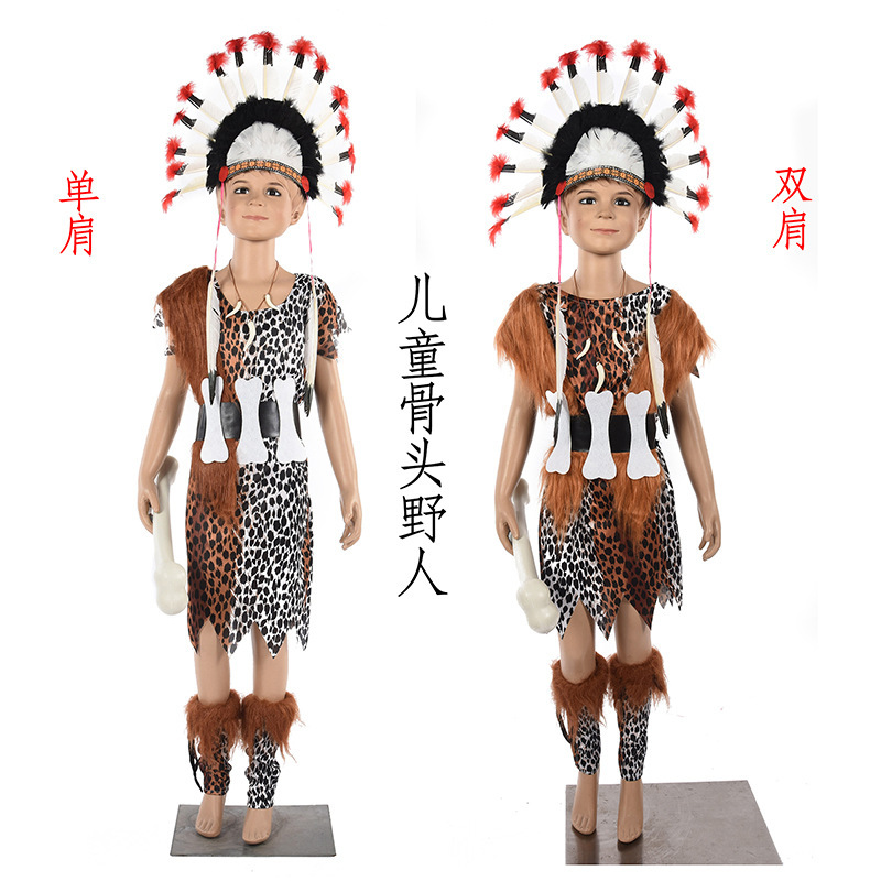 Kostum cosplay Halloween anak-anak, kostum Savage anak-anak, pakaian tipis India, pakaian pertunjukan savage, pakaian pria