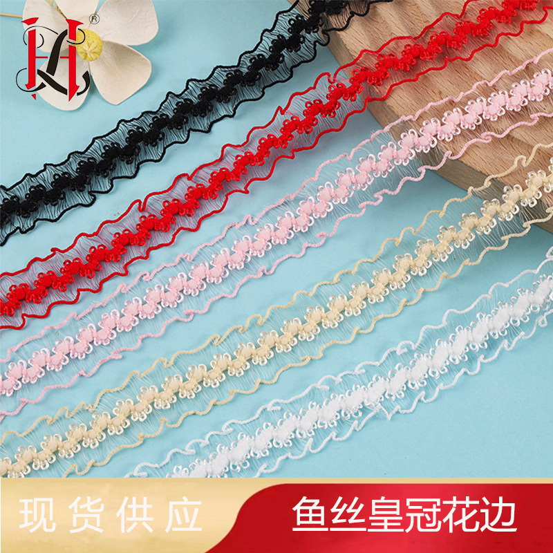Aksesoris kain pakaian boneka pita elastis sutra motif mahkota, tersedia, untuk kerajinan tangan DIY renda lipit