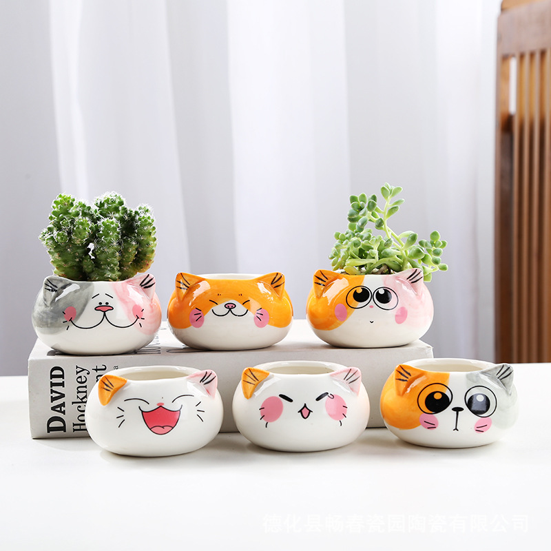 Model Baru Grosir Kreatif Kartun Hewan Portabel Bunga Lucu Berbentuk Kucing Keramik Menanam Pot Meja Berkebun Segar