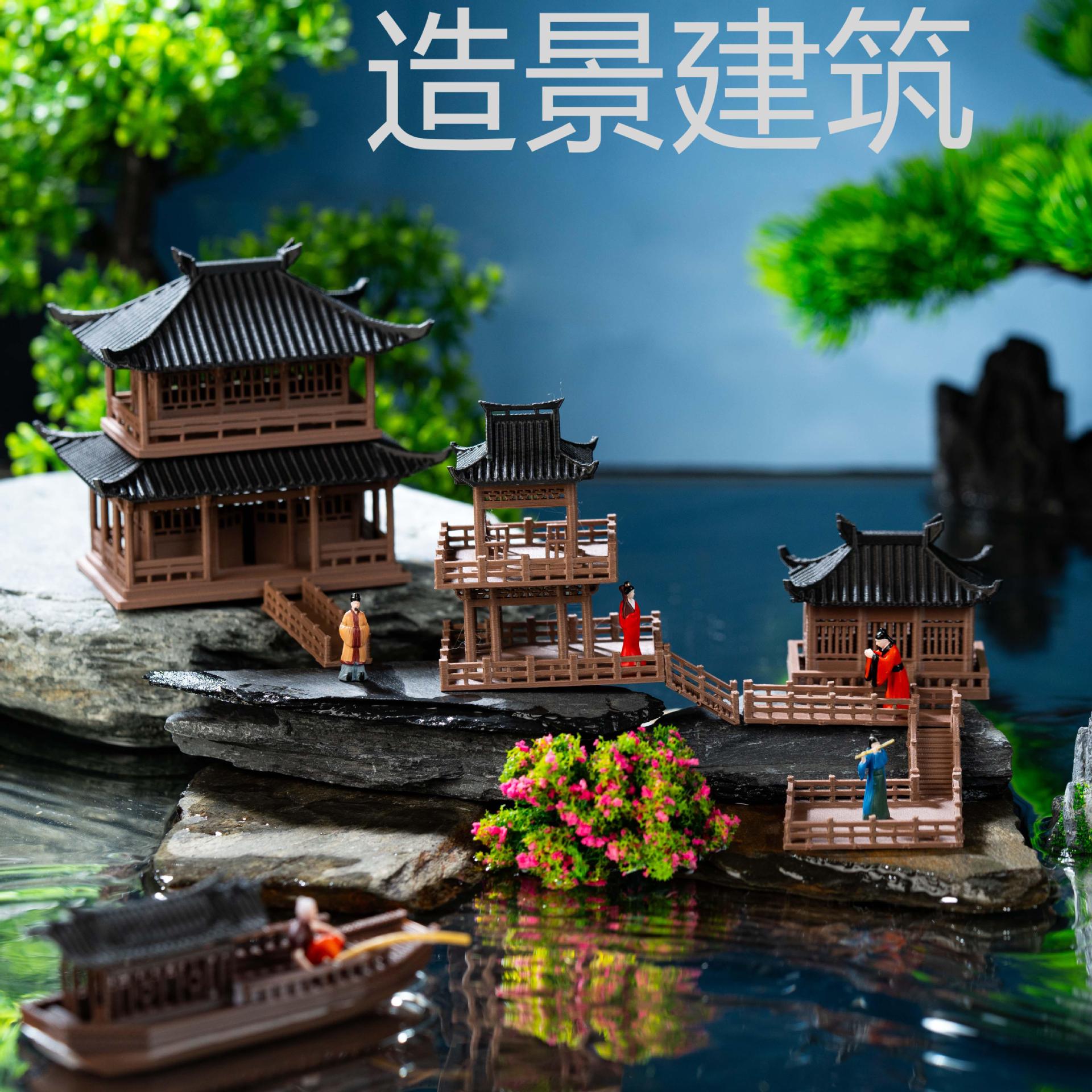 Model arsitektur mikro-landskap siap pakai, batu hias, bangunan kuno, paviliun, meja pasir, bonsai, ornamen air dan darat, gaya antik