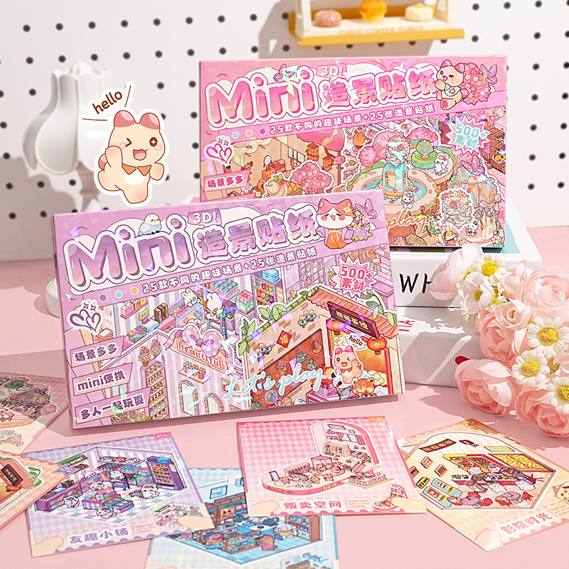 Stiker Pemandangan Mini Dunia Miniatur Stiker Kotak Hadiah 3D Tumpukan Adegan Visual DIY Buatan Tangan Anak-Anak