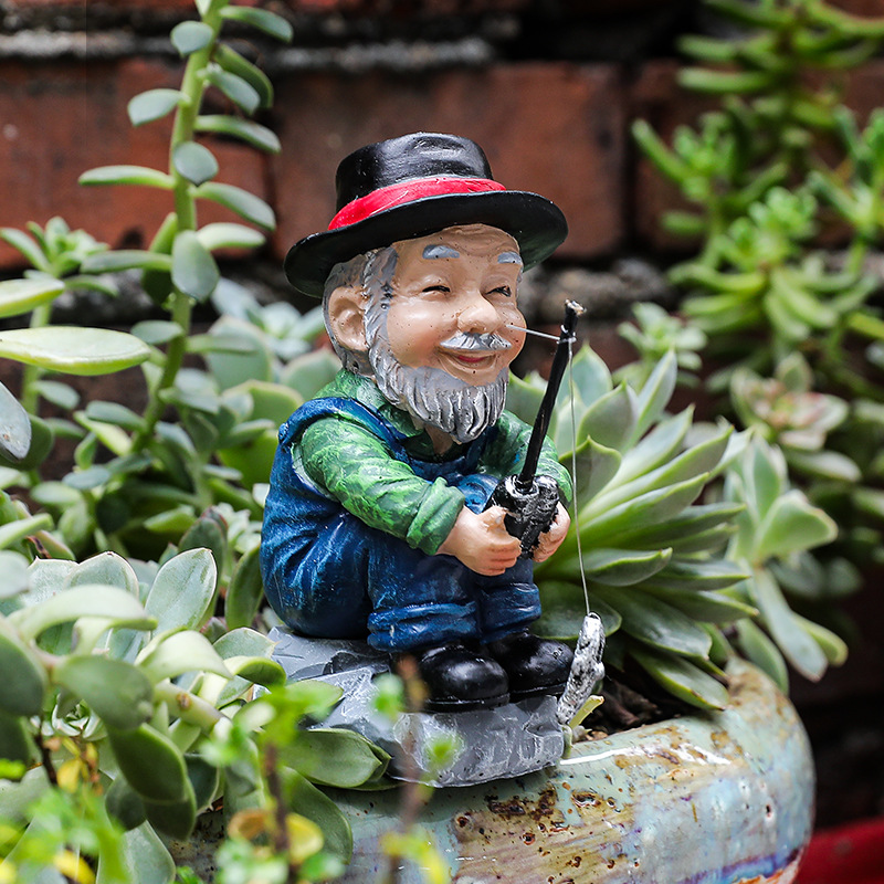 跨境新品带帽钓鱼老爷爷摆件家居客厅鱼缸造景装饰花园盆栽景观