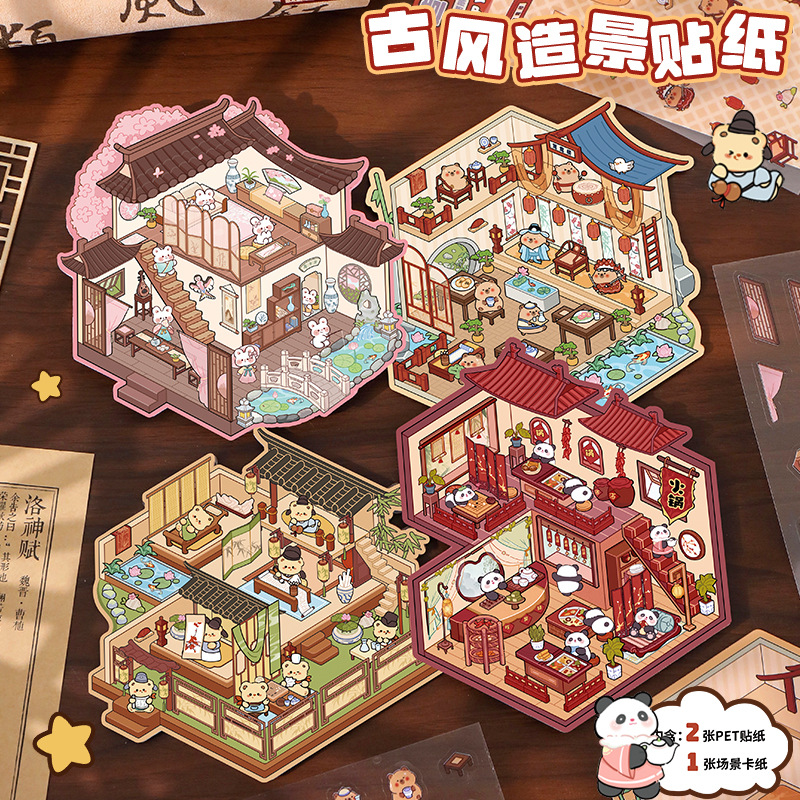 Yu Jian Eslite Stiker Lansekap Seri Panduan Kelangsungan Hidup Kuno Koleksi Pemandangan Miniatur Rumah Tiga Dimensi Gaya Tiongkok
