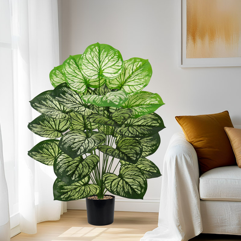 Simulasi tanaman hijau pola putih daun talas dekorasi rumah gaya Nordic
