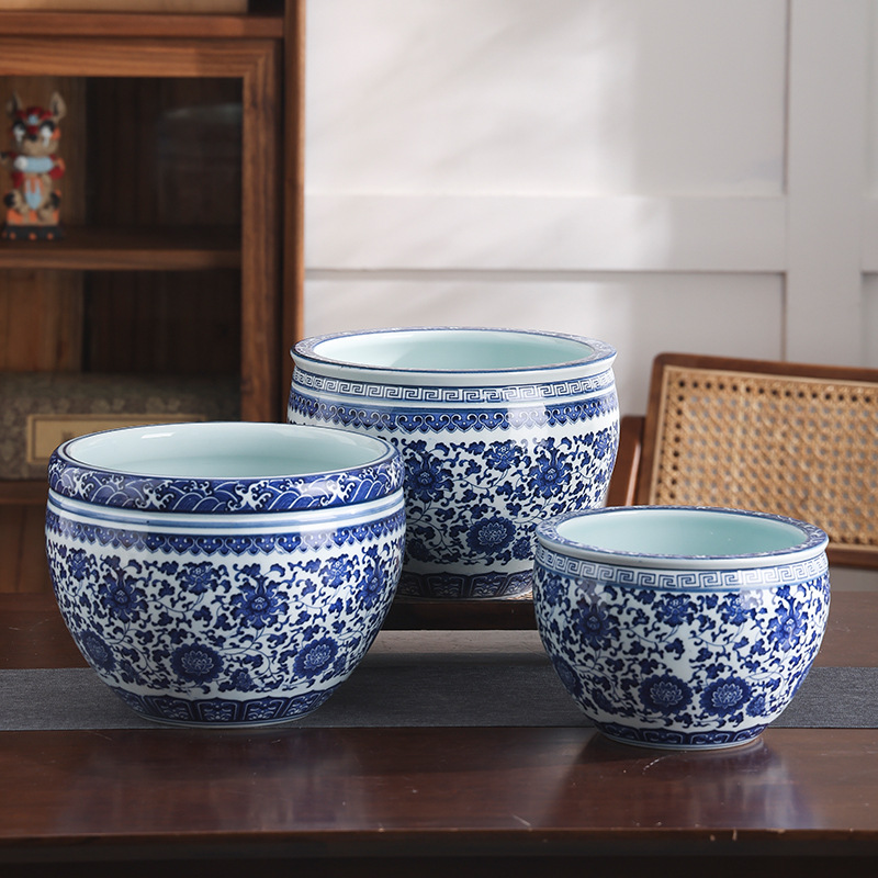 Jingdezhen Tangki Ikan Keramik Biru dan Putih Porselen Keramik Panci Ikan Emas Besar Panci Ikan Kura-kura Panci Ikan Mangkok Lotus Panci Bunga Teratai