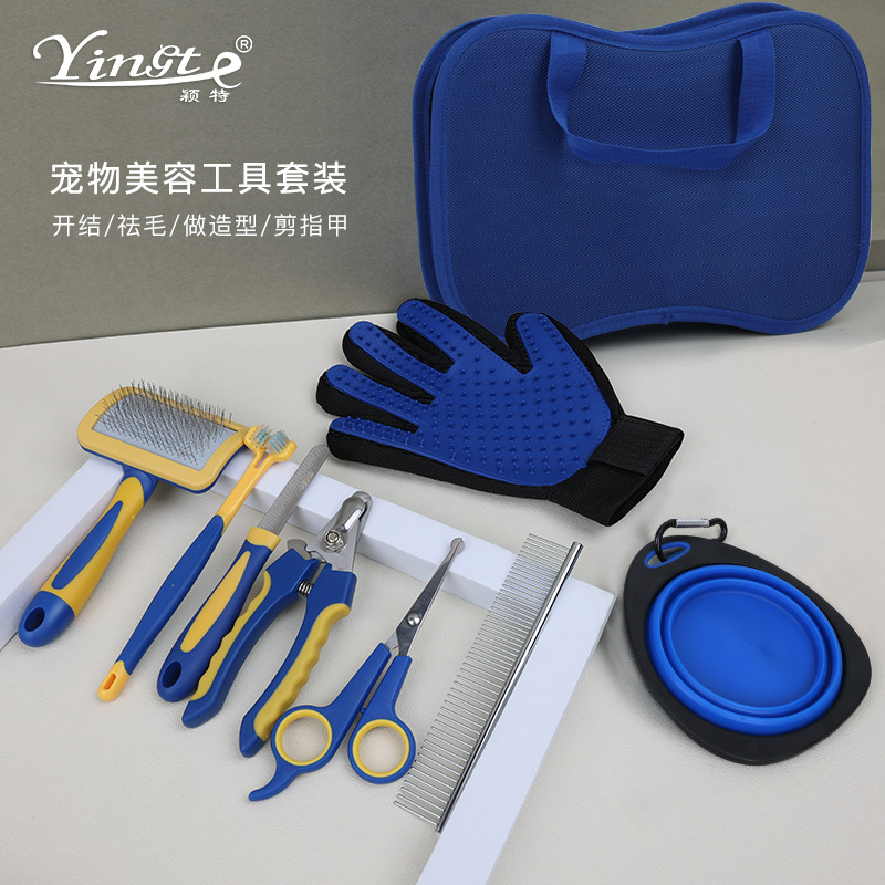 Set pakaian kecantikan pembersih rambut 8 buah, Persediaan hewan peliharaan sisir simpul lurus sisir gunting kuku pisau pemotong rambut sisir pudar
