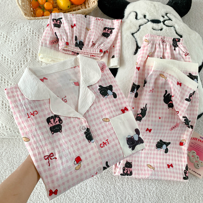 Baju Tidur Katun Wanita Bernilai Tinggi Pakaian Rumah Kucing Pita Kupu-Kupu Lucu Musim Panas Pakaian Rumah Tiga Potong Lengan Pendek Grosir