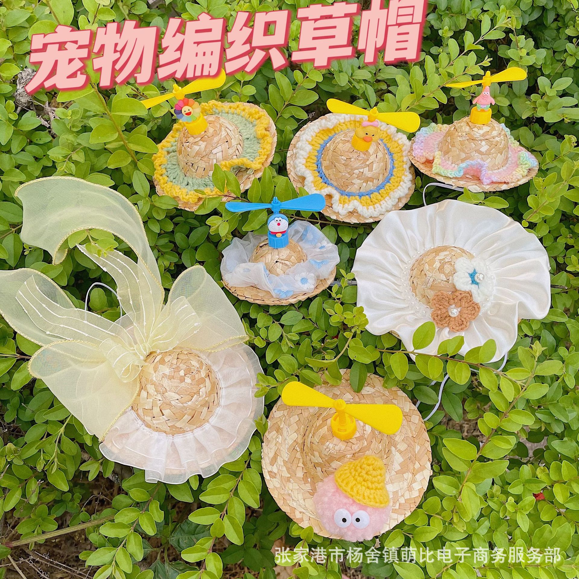Topi jerami rajut Foto Anjing kucing topi peliharaan selebriti internet lintas batas perhiasan lucu tahan matahari capung bambu musim panas